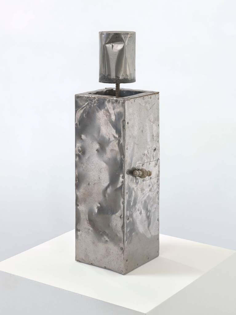Combine: sheet metal and enamel over wood with crank, gear, sealing wax, and tin can