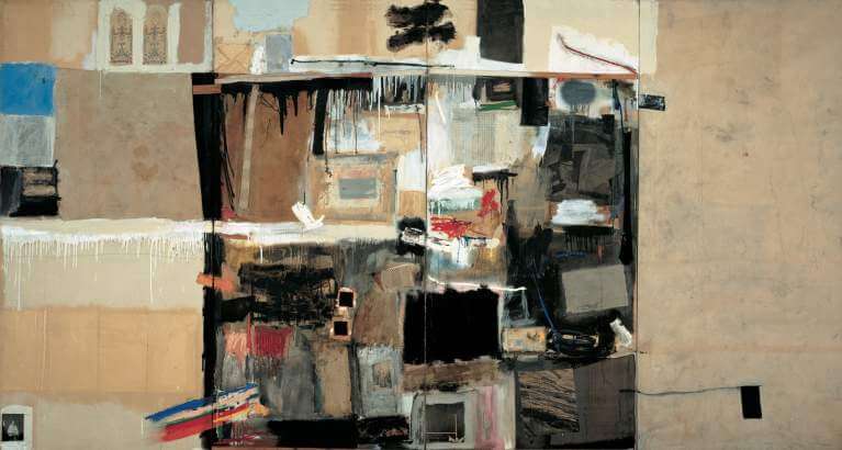 Combine: oil, graphite, paper, fabric, newsprint, printed reproductions, photographs, wood, and graphite body tracing on four canvases