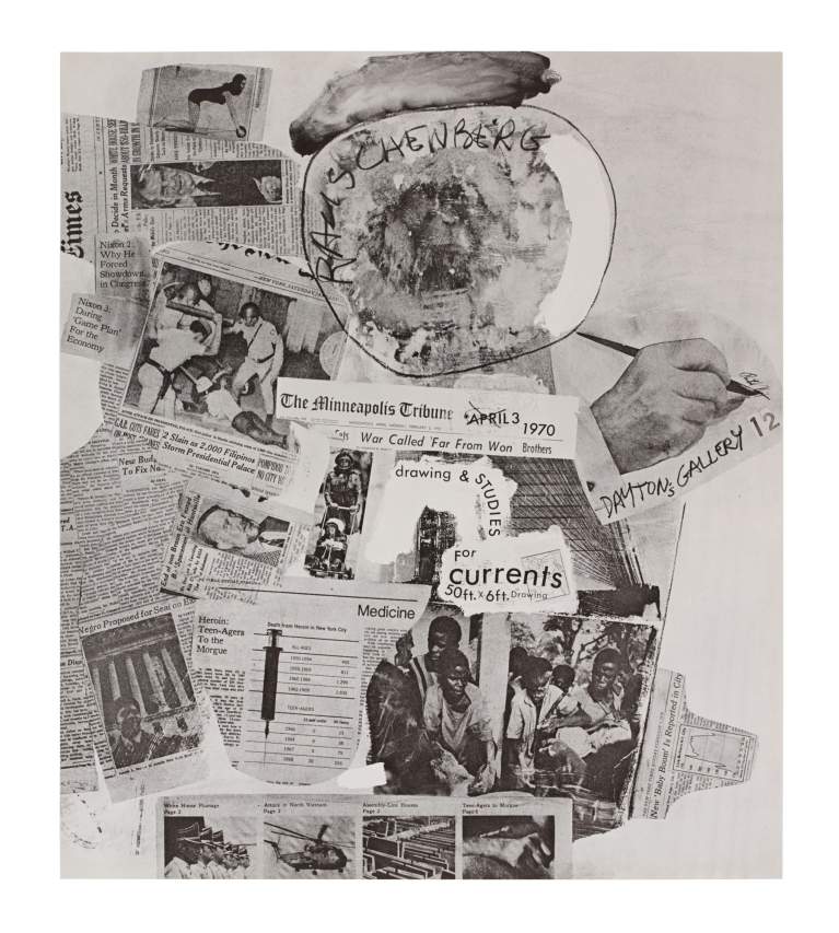 Rauschenberg’s transfer drawings combine imagery excerpted from printed mass media with hand drawn and painted passages to create pictorial poems.